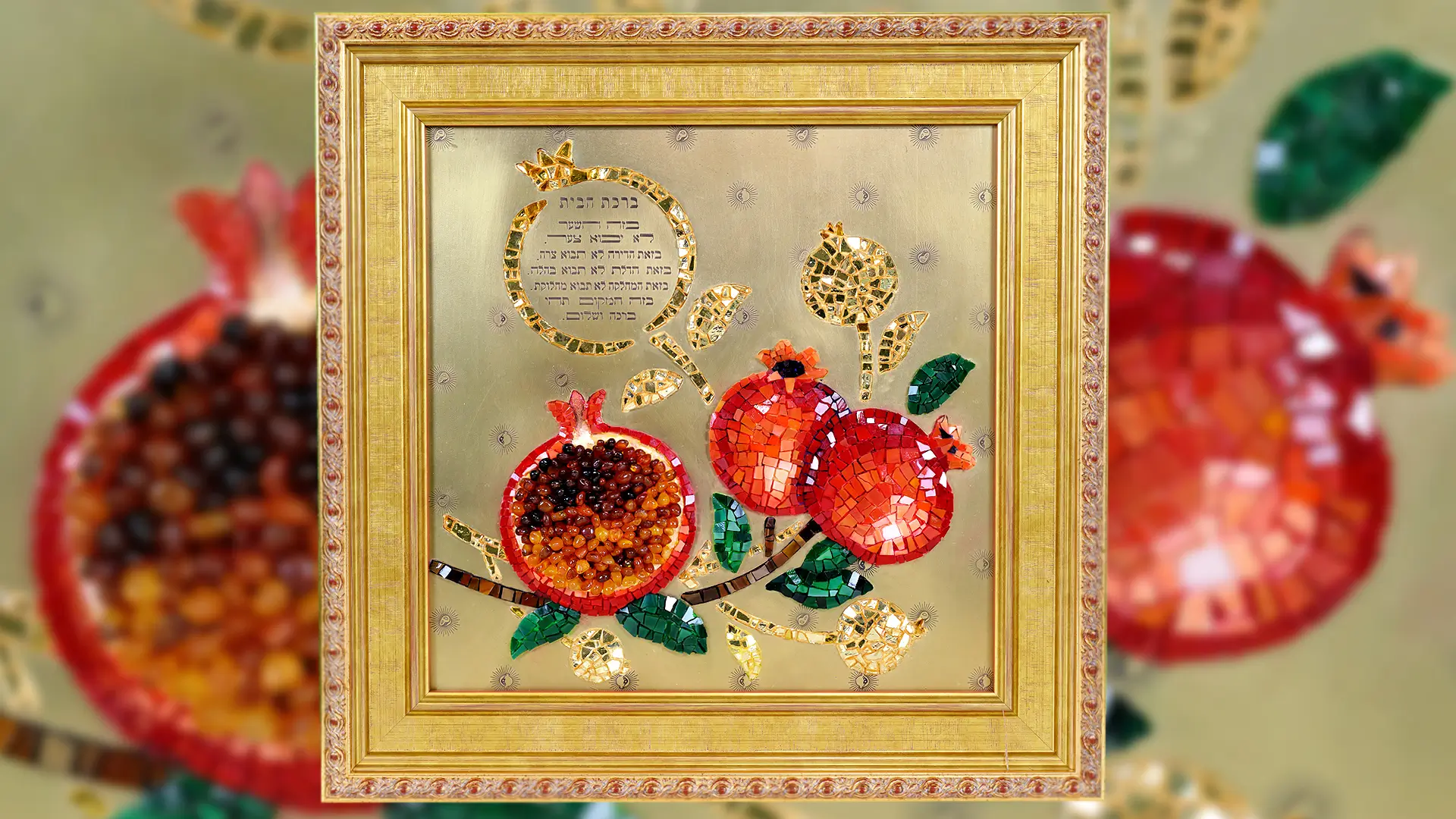 In the First Temple, the trees with golden fruits grow. Pomegranate trees grow just on the streets of Jerusalem. They are beautiful in bloom in spring and summer, and in autumn it is enough to reach out your hand to say a blessing over the pomegranate fruit. Pomegranate on gold is a picture of a peaceful and blessed home. And what could be more valuable than Shalom Bayis?