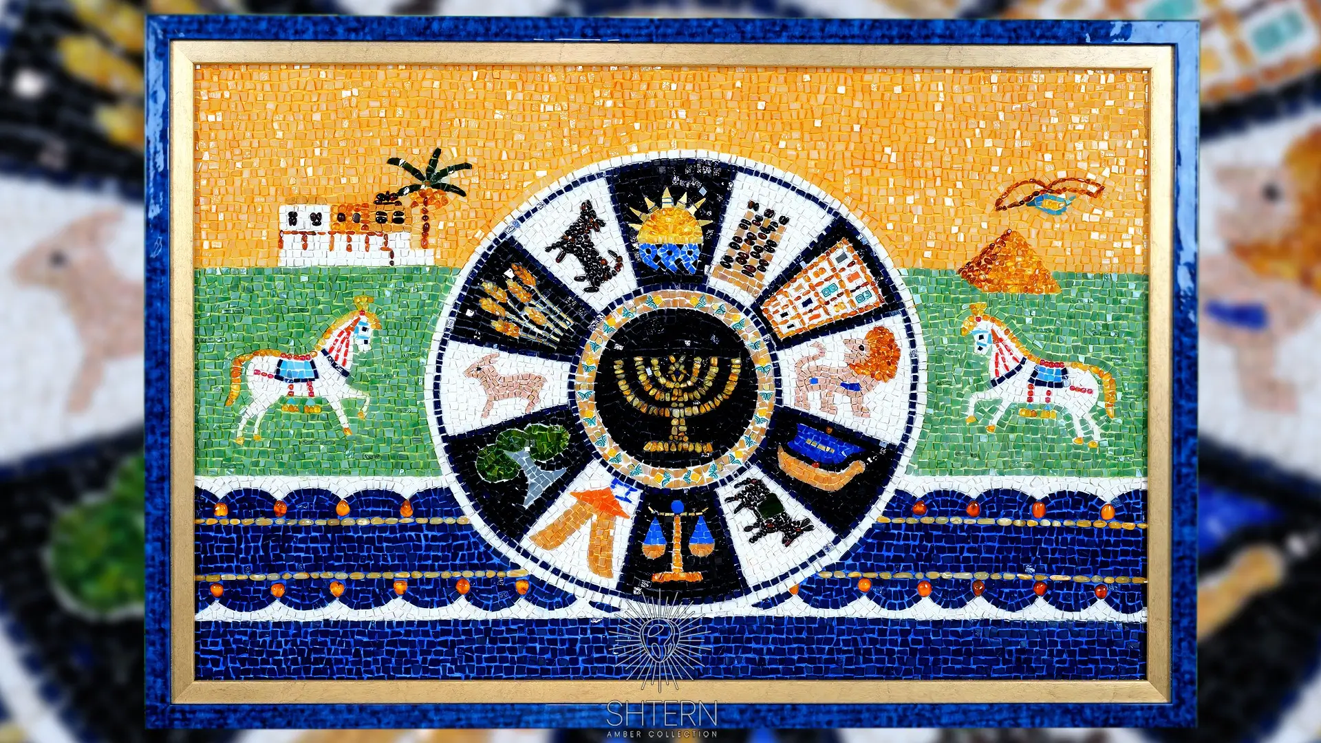 The reproduction in amber of the mosaic by Yael Portugheis "12 Tribes of Israel" was made by us as an example of the capabilities of our craftsmen. At your request, we will embody your desire in the form of a similar picture that will please the eye and heart and complement your home, office, or synagogue with the beauty of Jewish art.